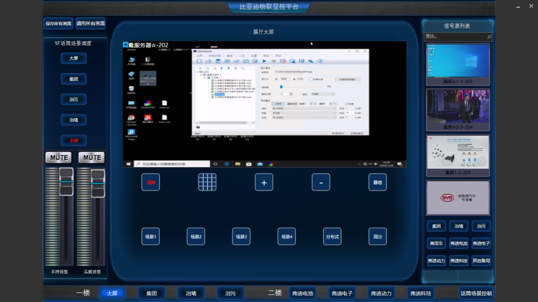 现场每个区域的音响,都是通过DANACOID分布式系统的输出节点去输出的声音。在客户端软件上,可视化界面里做了每个区域音响的控制,使现场每块屏都能实现声音的控制。
