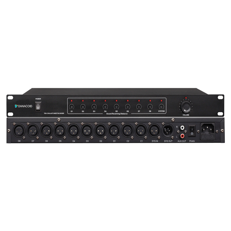 八路智能混音器能有效地防止会议进行过程中突如其来的强声源(如集体掌声、打碎物品声等)的冲击而造成的大范围“啸叫”现象出现,使系统能稳定使用,得到保护。